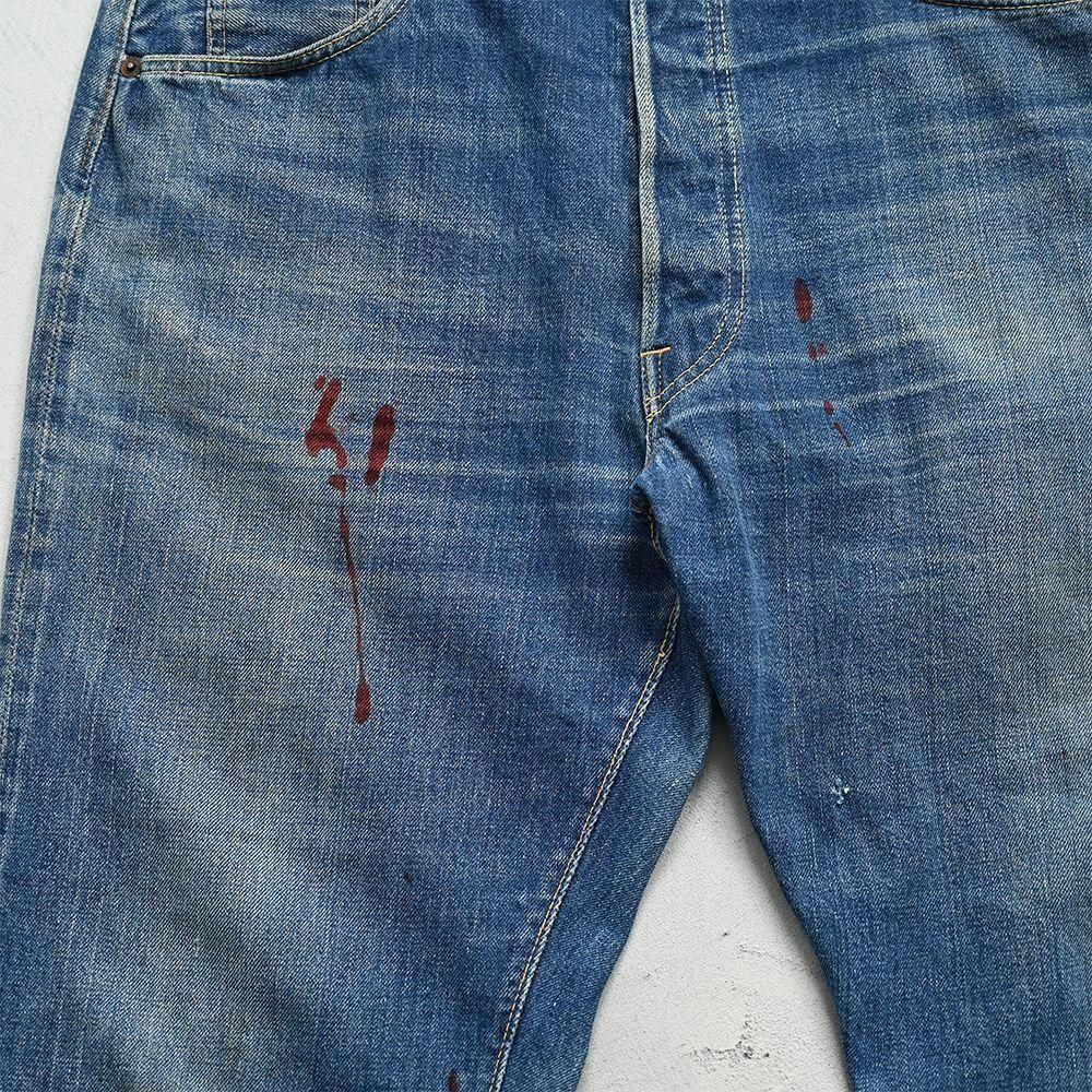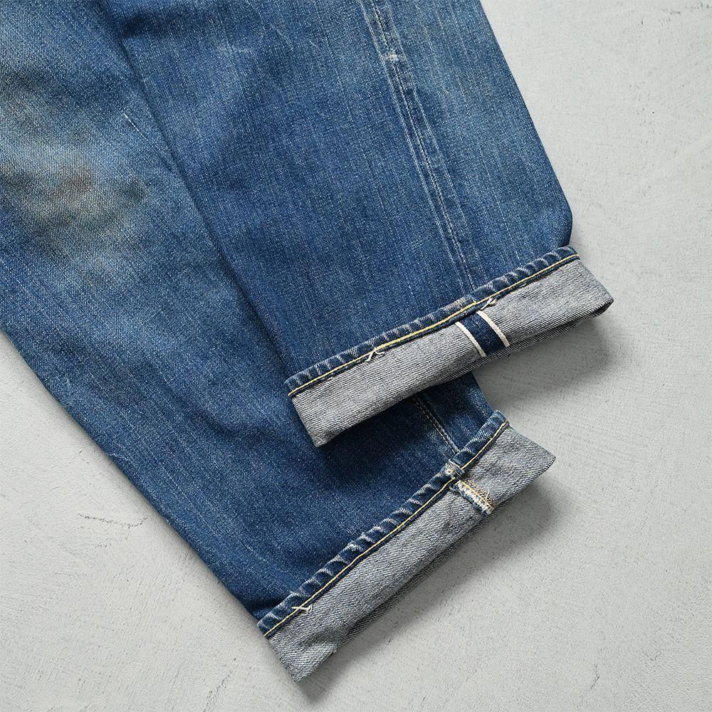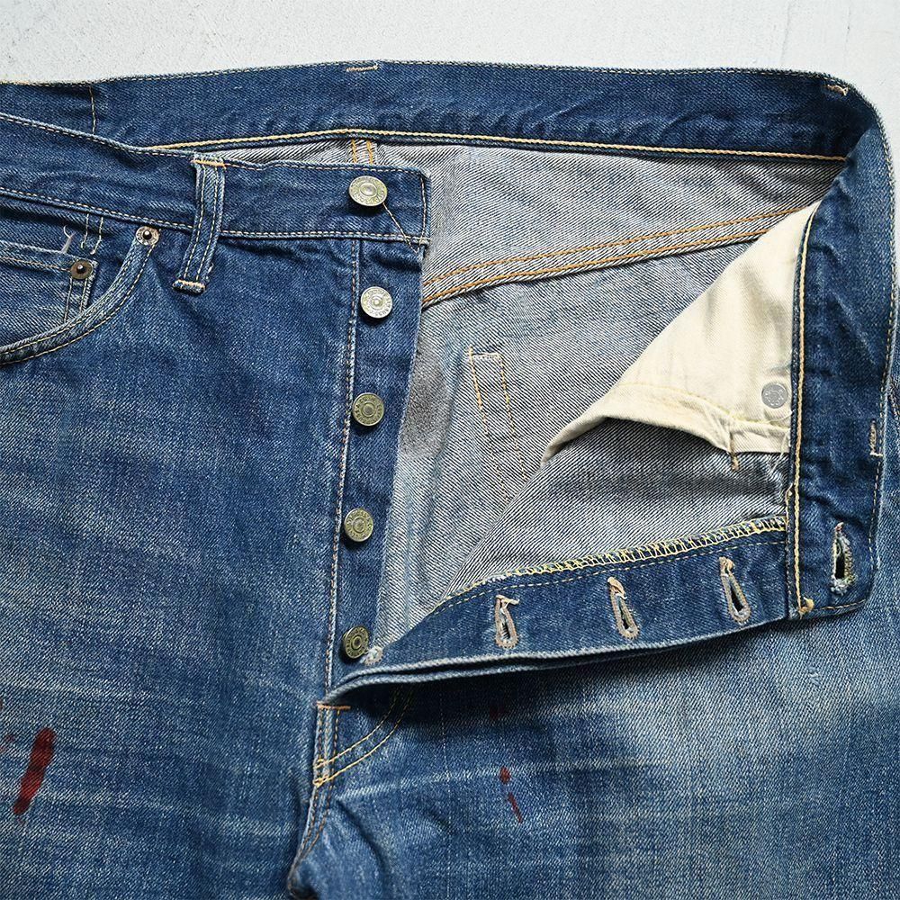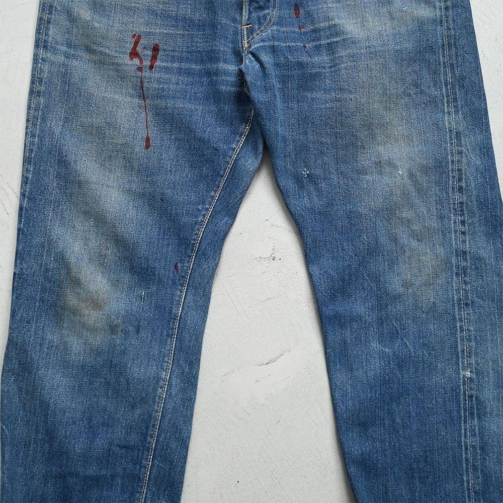 詳細:GOOD CONDITION。所々赤いペンキ飛びあり。ヒップにタタキリペアあり。ポケットスレーキに簡単な補修箇所あり。両裾周りに細かな擦れ・ダメージ解れ箇所、チェーンステッチでリステッチあり。アーキュエイトにステッチ飛びあり。全体的に気になるような箇所もなく良好なUSEDコンディションです。