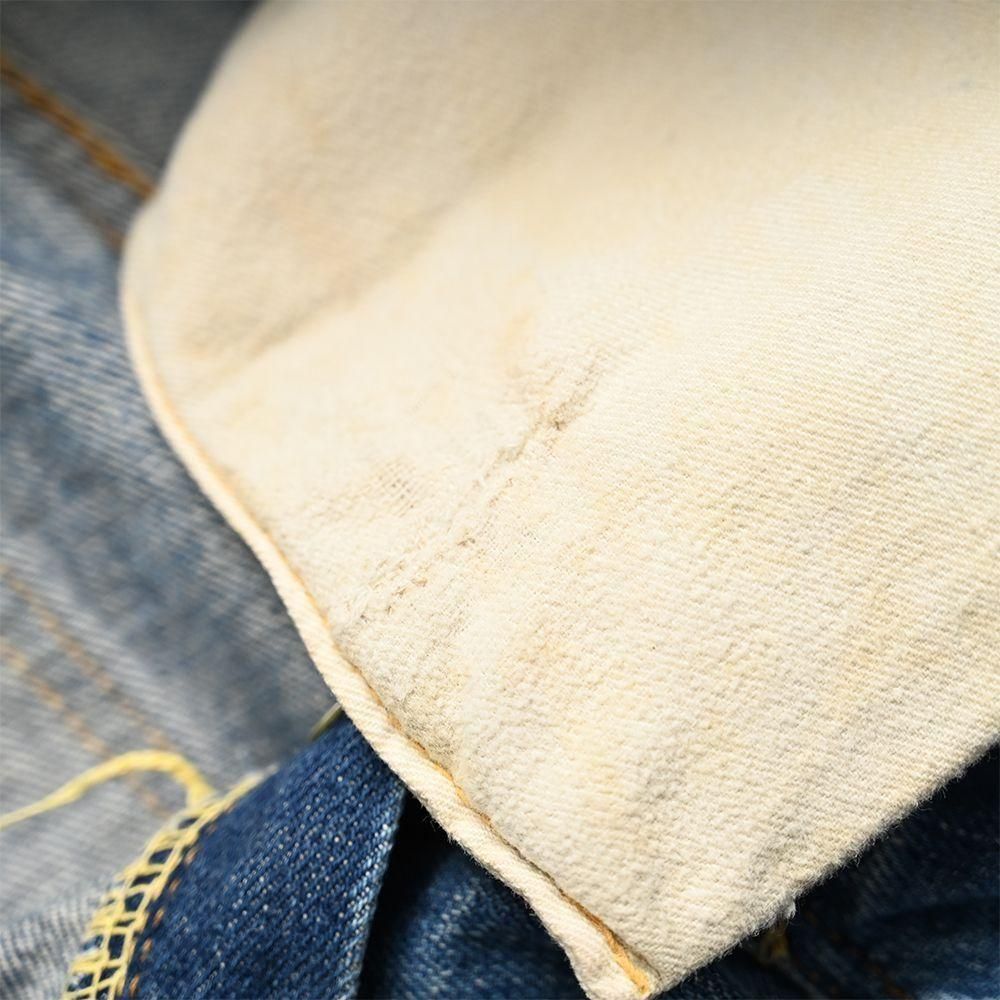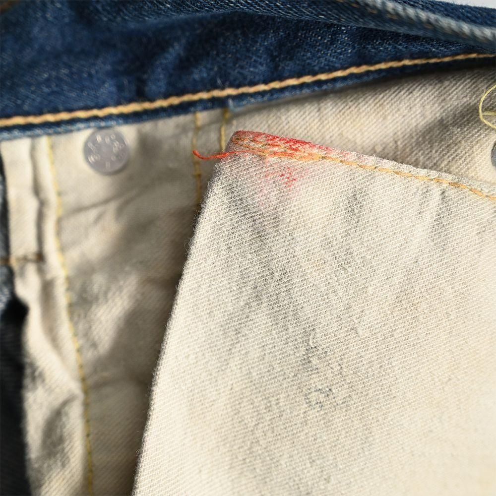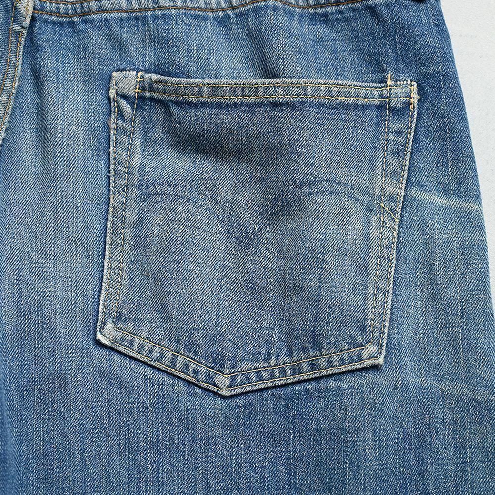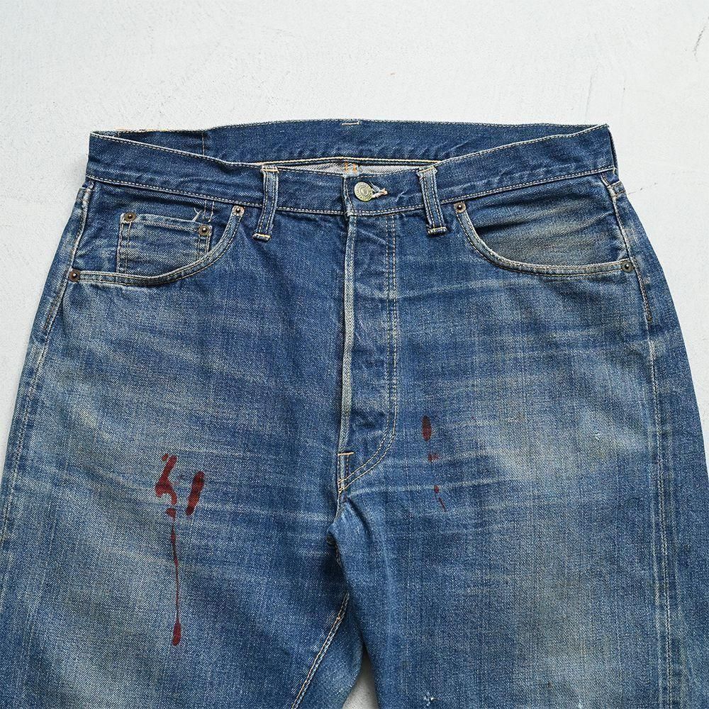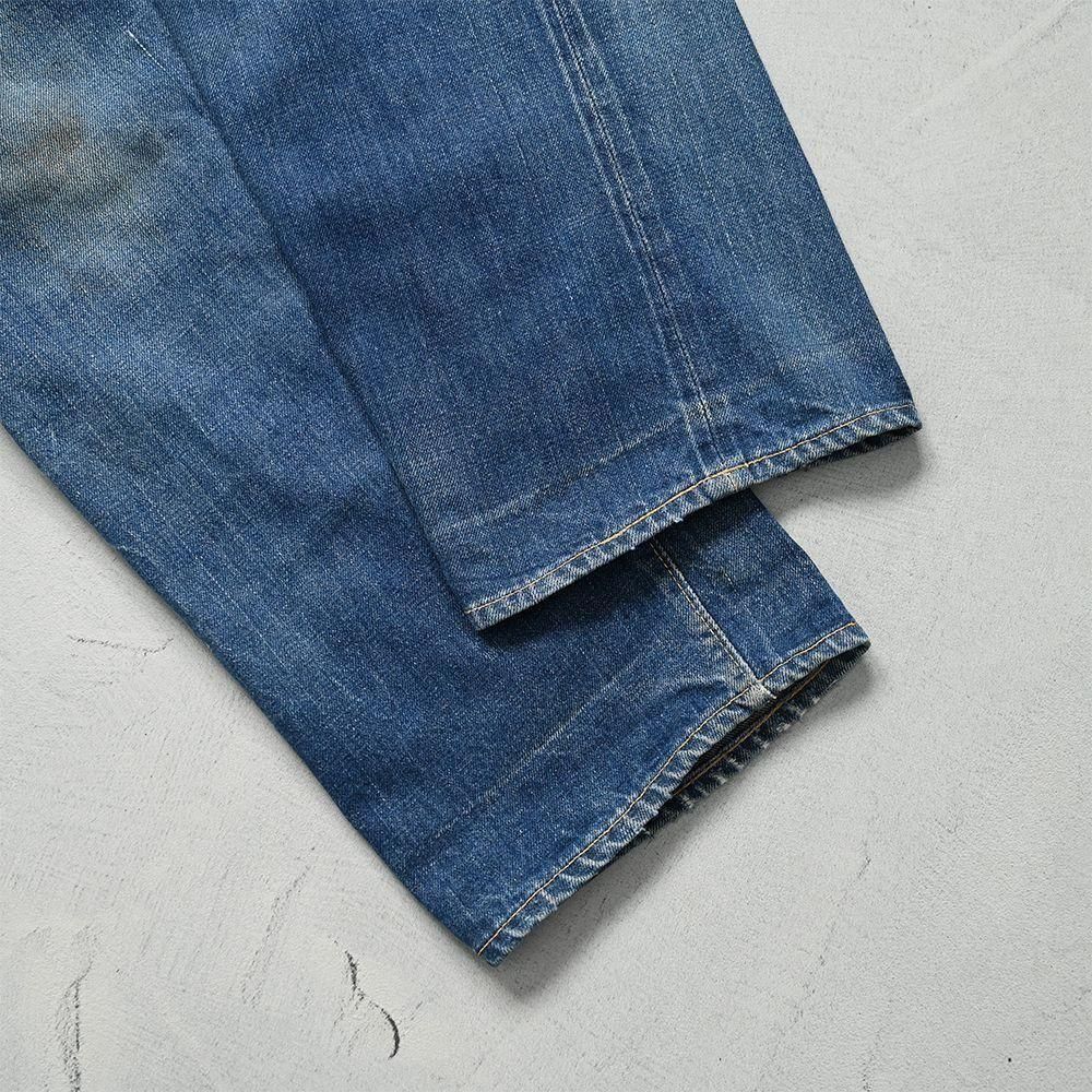 詳細:GOOD CONDITION。所々赤いペンキ飛びあり。ヒップにタタキリペアあり。ポケットスレーキに簡単な補修箇所あり。両裾周りに細かな擦れ・ダメージ解れ箇所、チェーンステッチでリステッチあり。アーキュエイトにステッチ飛びあり。全体的に気になるような箇所もなく良好なUSEDコンディションです。