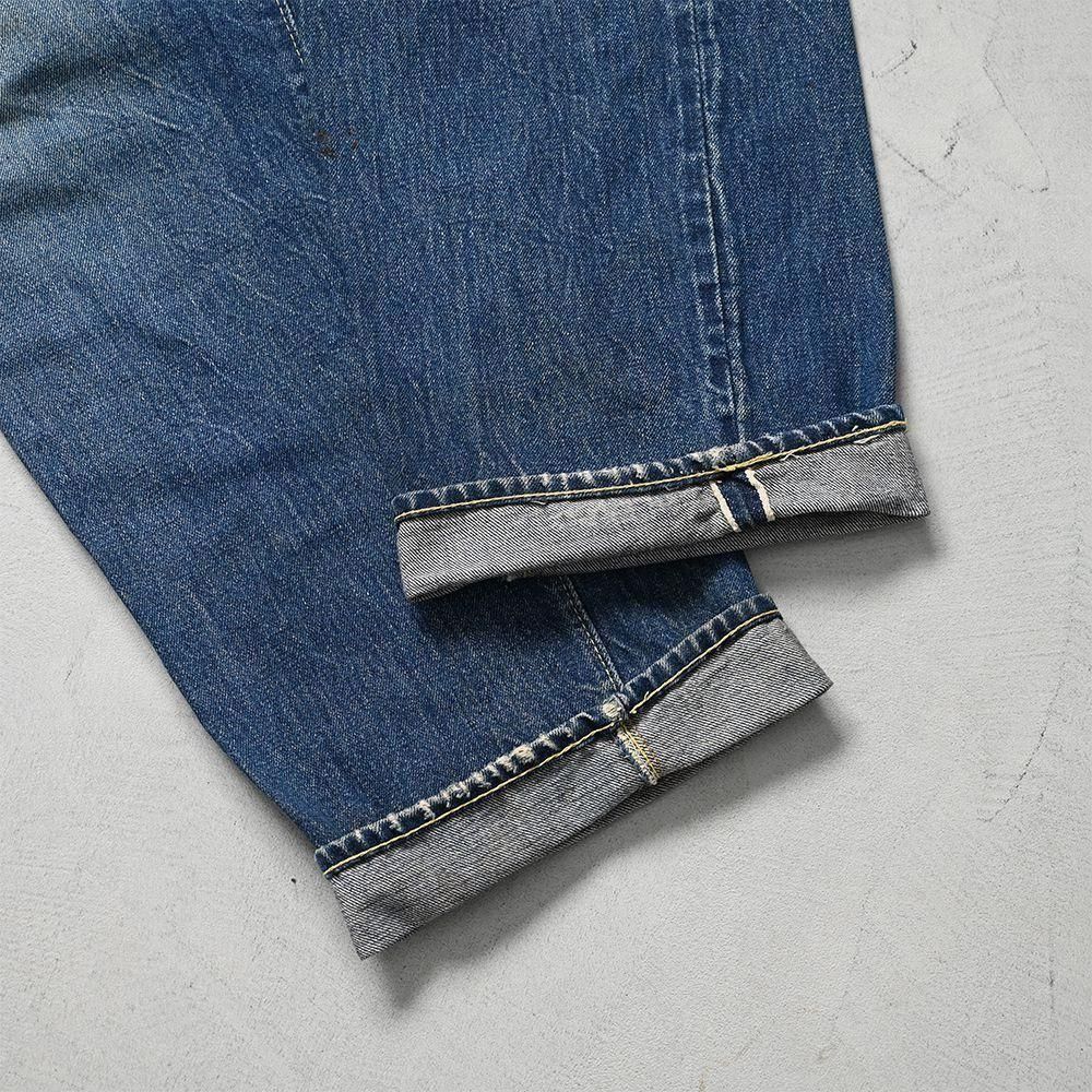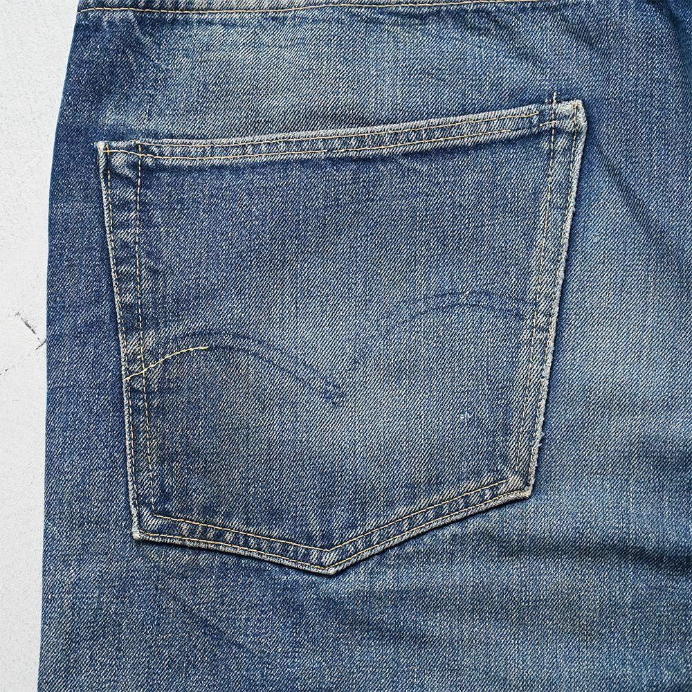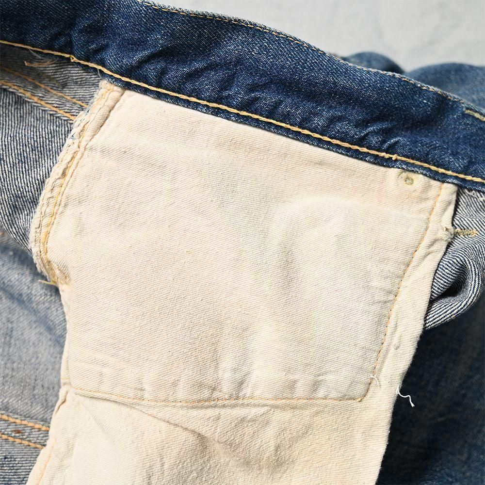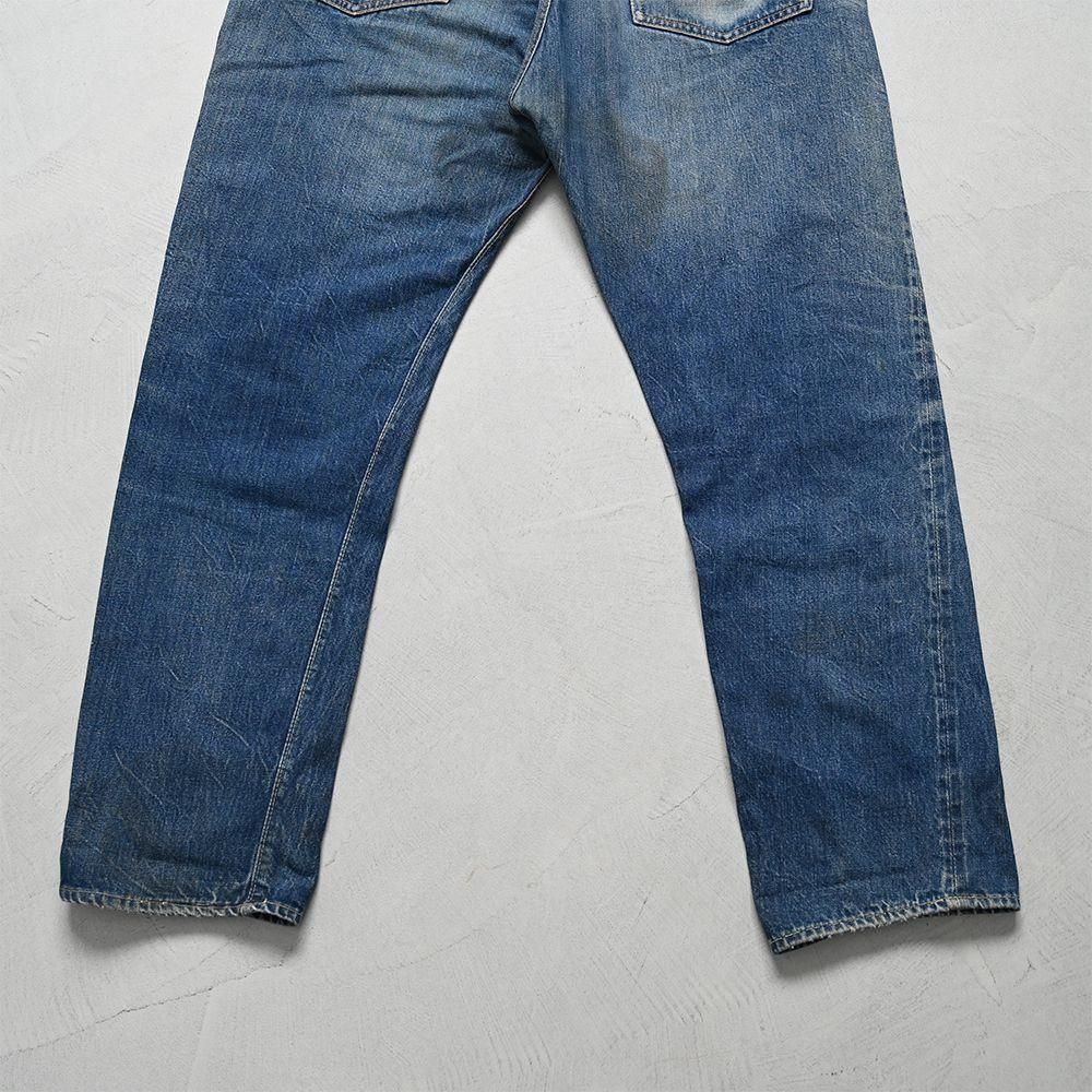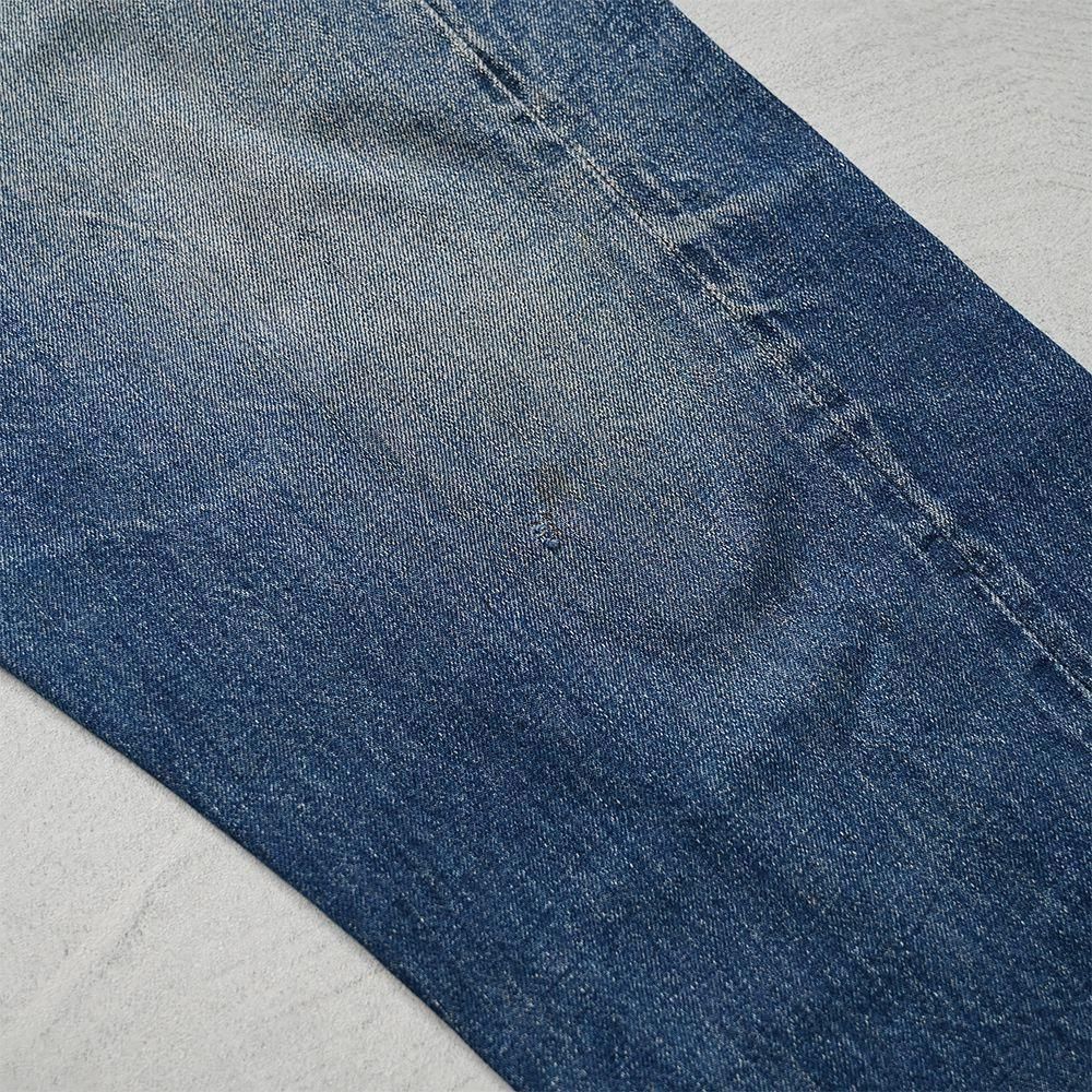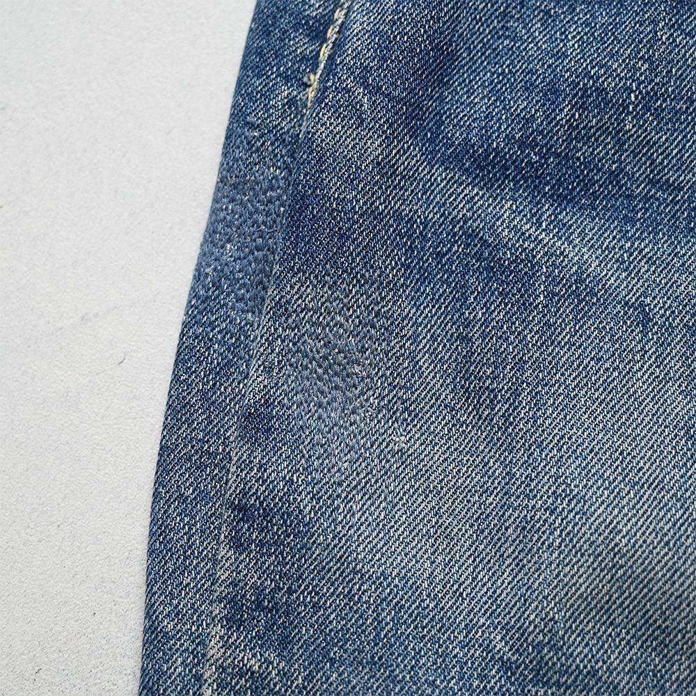 詳細:GOOD USED CONDITION。リベット欠損。右ポケット下あたりにタタキリペアあり。裾にスレあり、オリジナルですがリステッチあり。右にピンホールあり。スレーキに補修あり。ヒップから股にかけてリステッチあり。右ヒップポケットに破れあり。経年の薄汚れやシミ・アタリあり。生地もしっかりしており良いUSEDコンディションです。