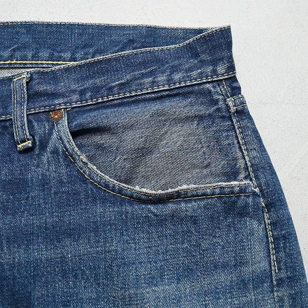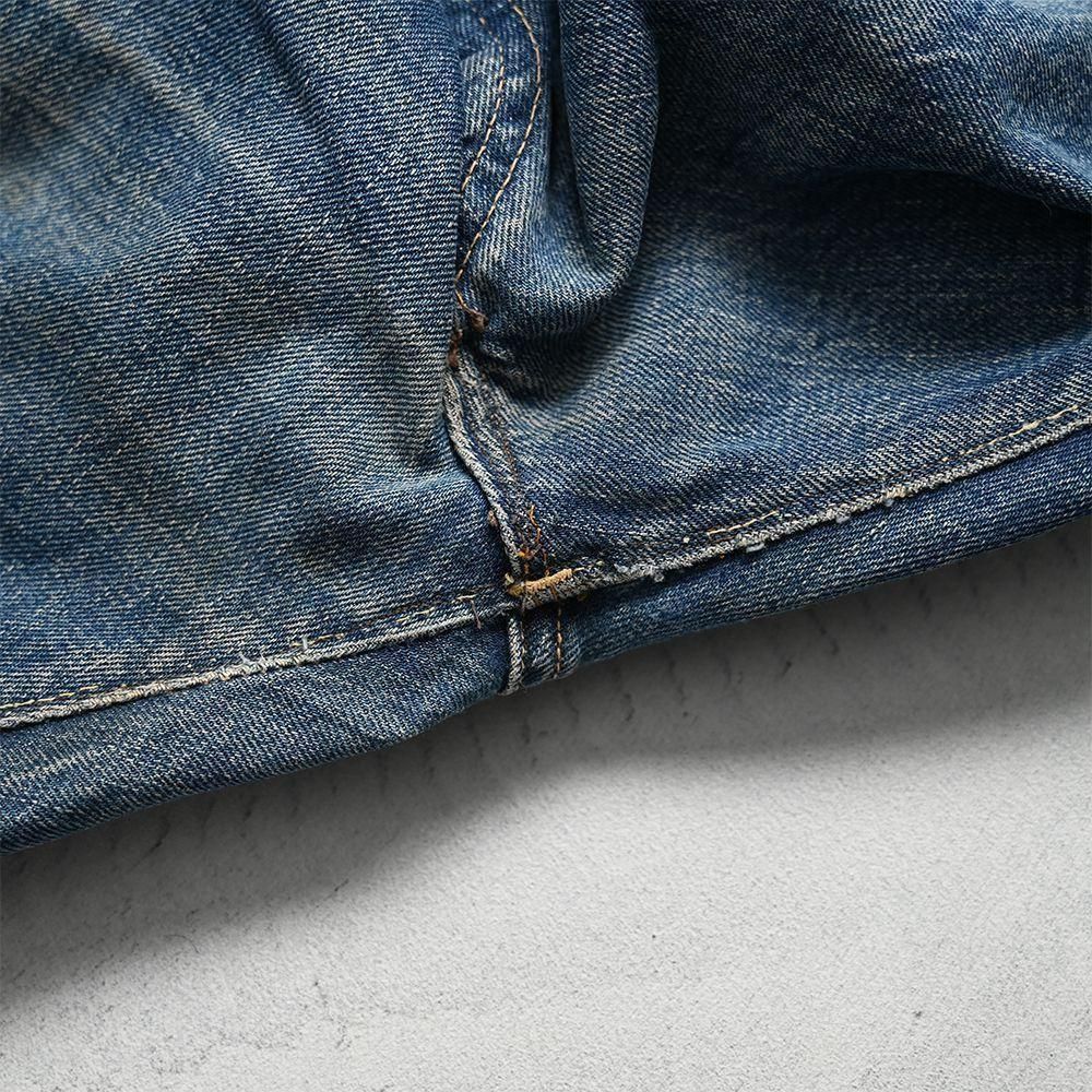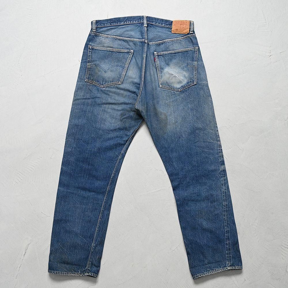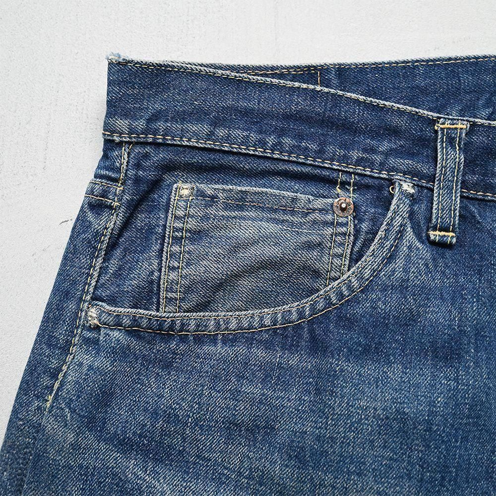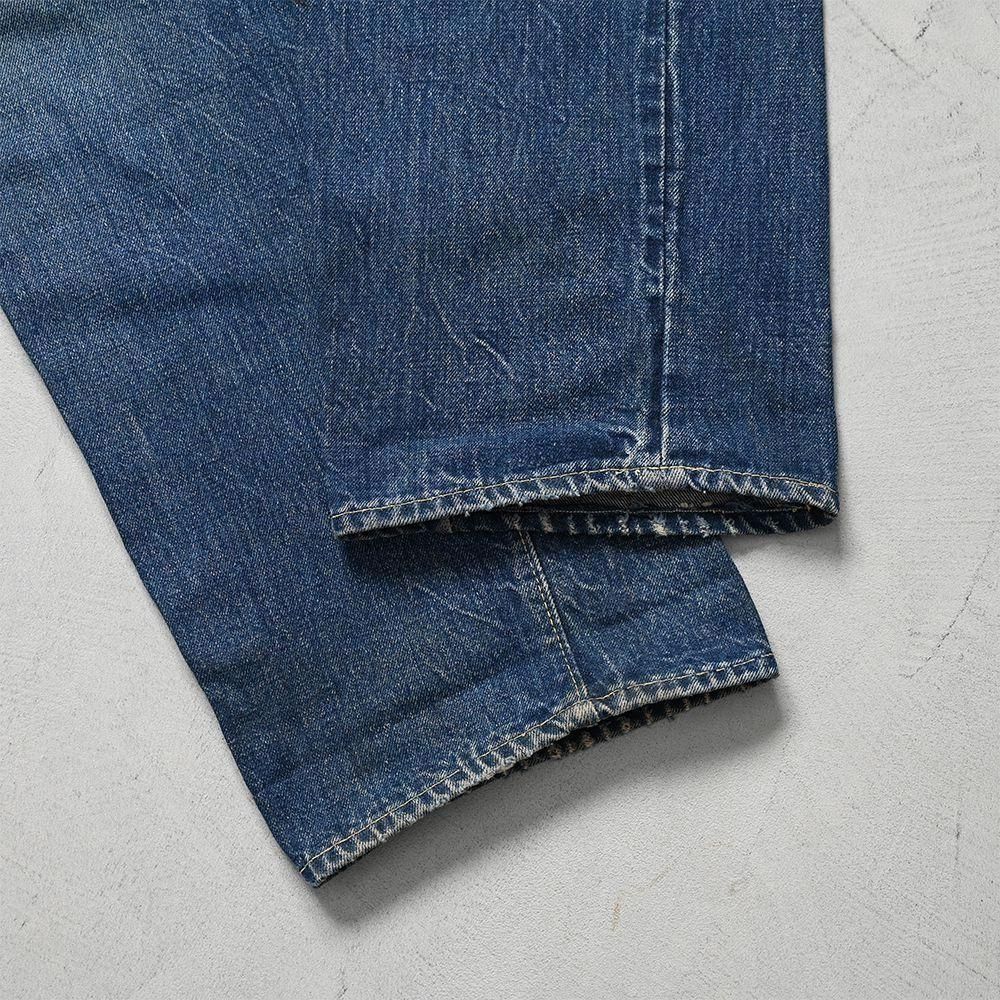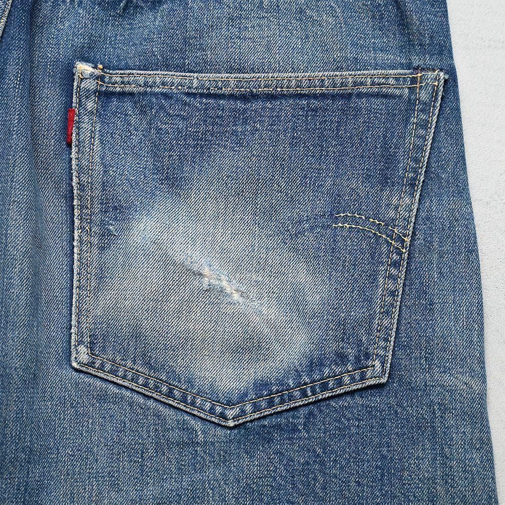 詳細:GOOD USED CONDITION。リベット欠損。右ポケット下あたりにタタキリペアあり。裾にスレあり、オリジナルですがリステッチあり。右にピンホールあり。スレーキに補修あり。ヒップから股にかけてリステッチあり。右ヒップポケットに破れあり。経年の薄汚れやシミ・アタリあり。生地もしっかりしており良いUSEDコンディションです。