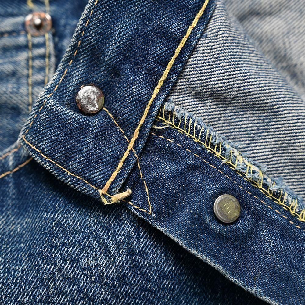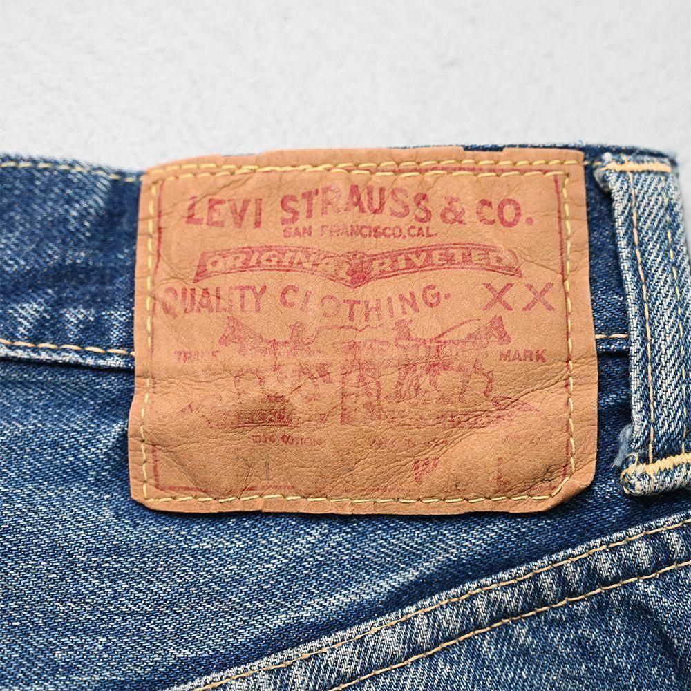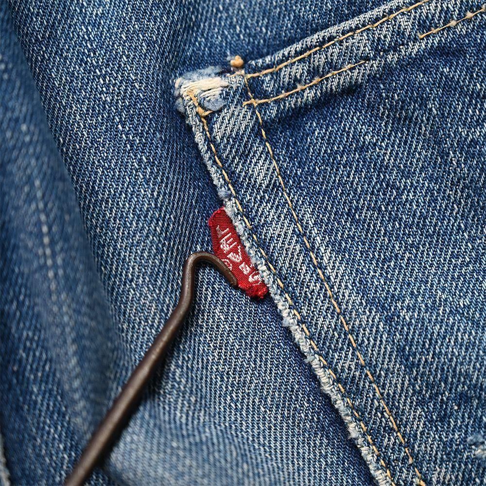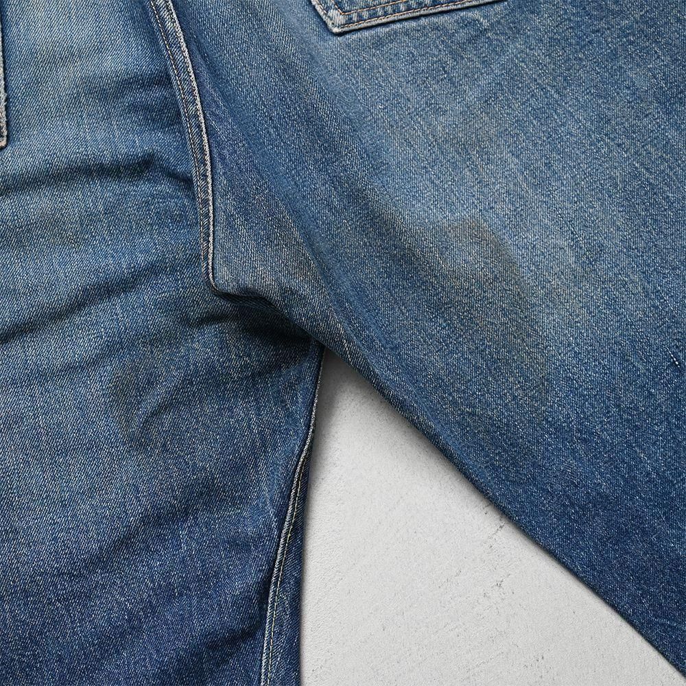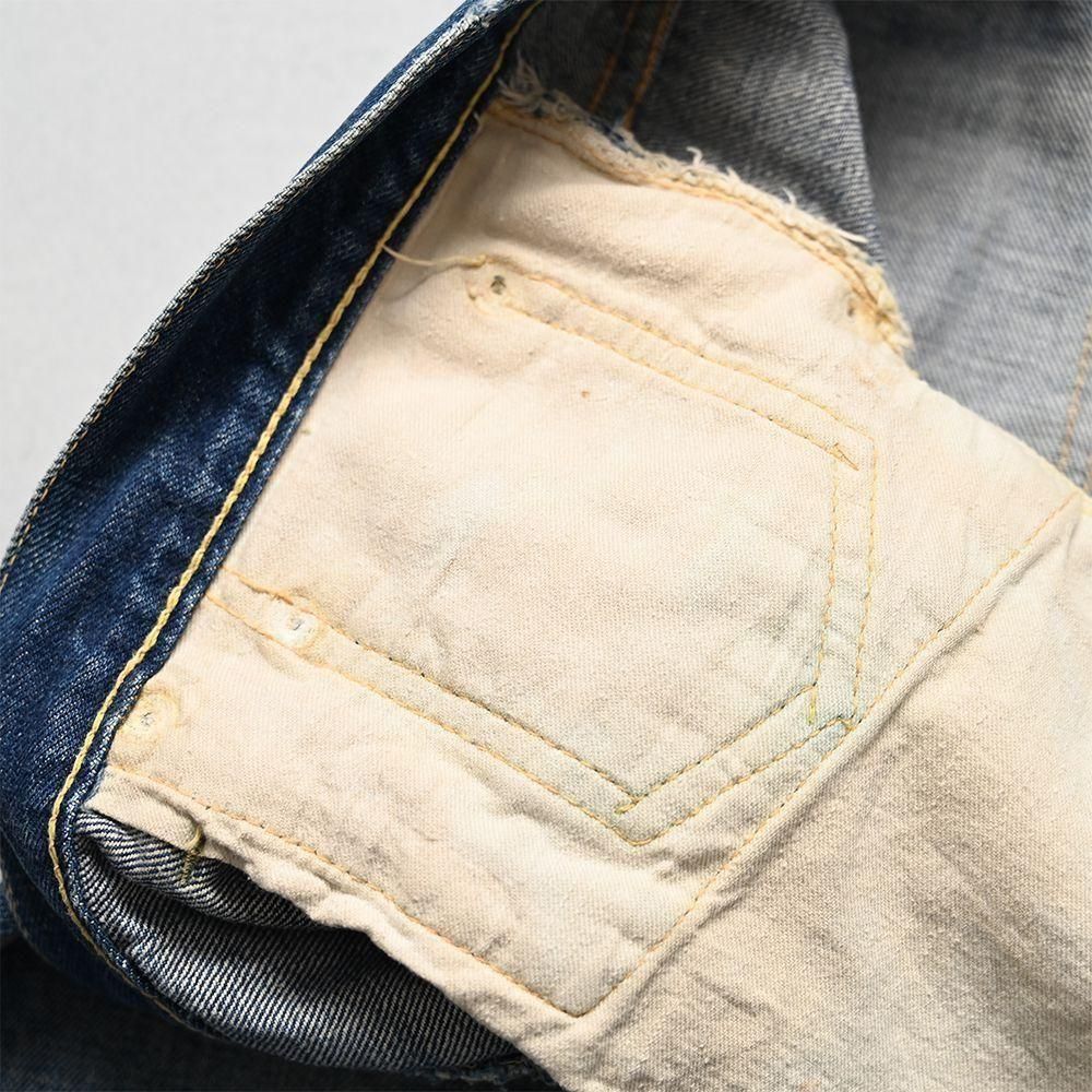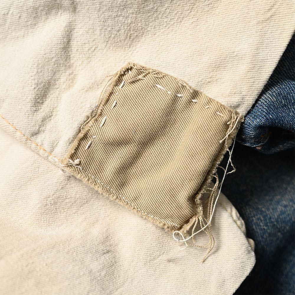 詳細:GOOD USED CONDITION。リベット欠損。右ポケット下あたりにタタキリペアあり。裾にスレあり、オリジナルですがリステッチあり。右にピンホールあり。スレーキに補修あり。ヒップから股にかけてリステッチあり。右ヒップポケットに破れあり。経年の薄汚れやシミ・アタリあり。生地もしっかりしており良いUSEDコンディションです。