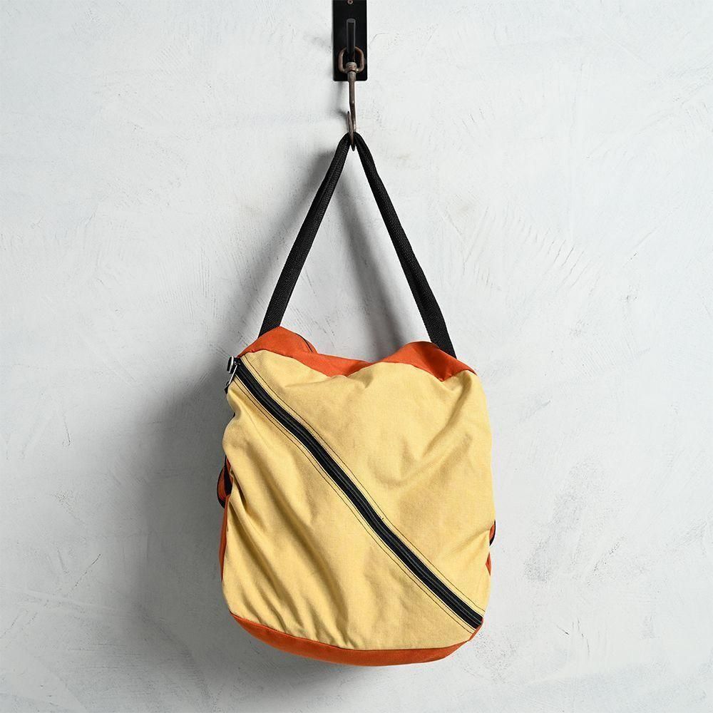 正方形で両面に斜めにジッパーが走った面白い構造のバッグになります。