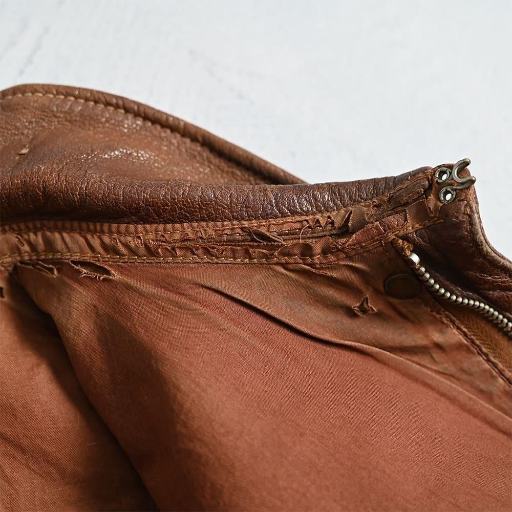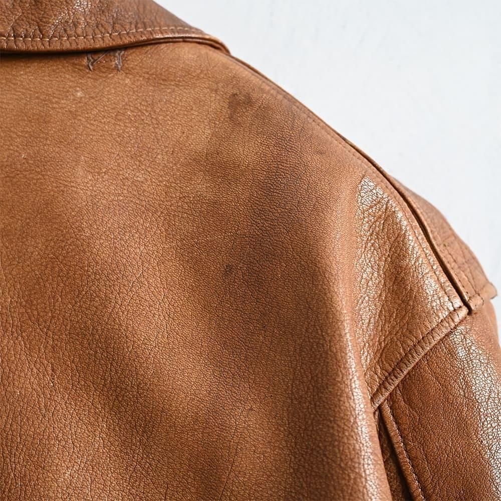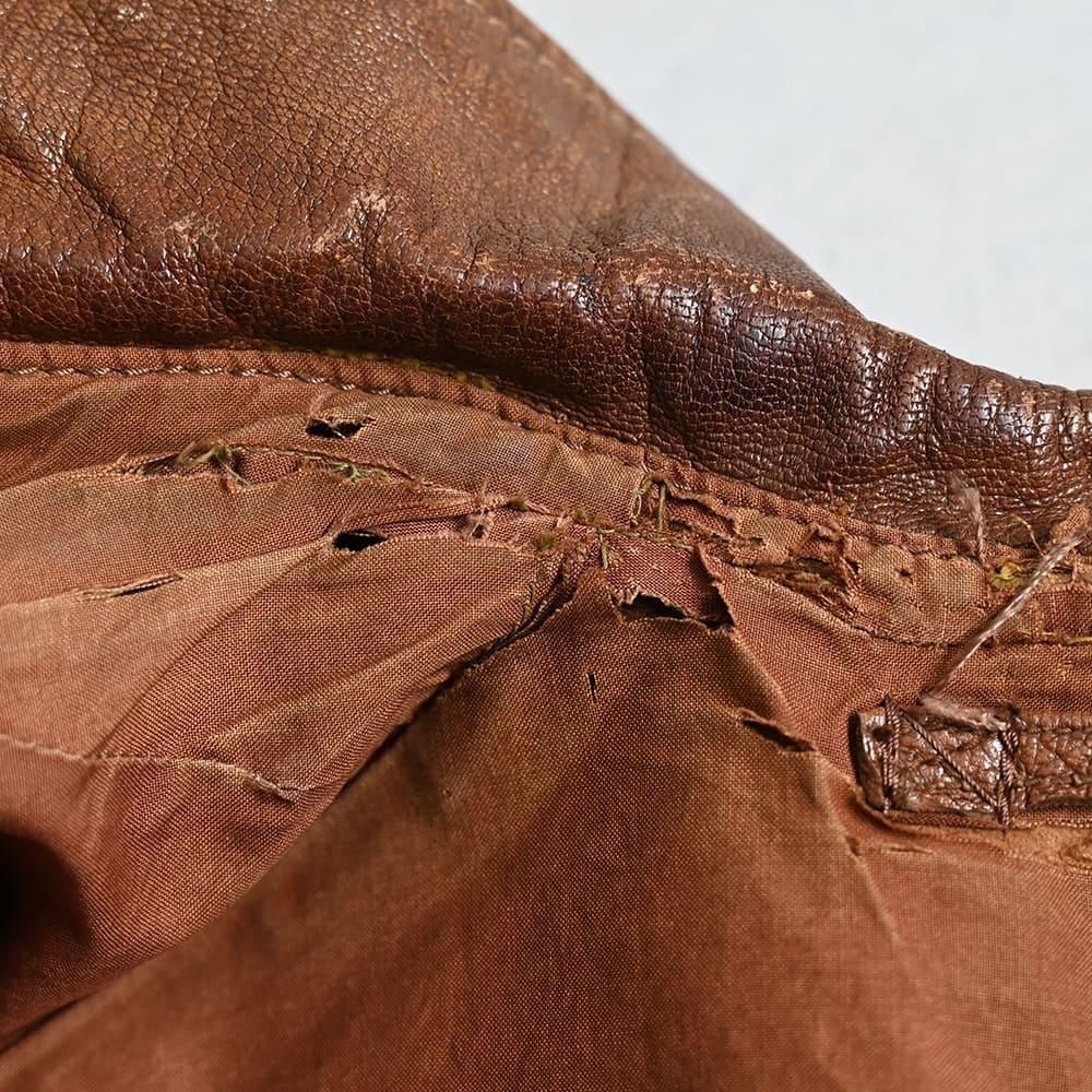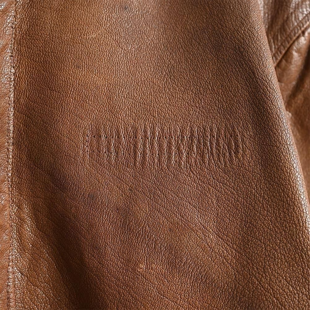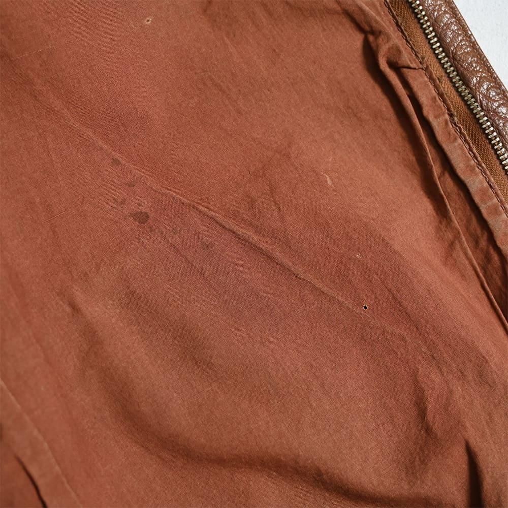 詳細:GOOD CONDITION。左胸ネームプレートを外したステッチ痕あり。各リブに解れ小穴・ダメージ解れ箇所あり。内側のライニングにダメージ箇所あり。レザー表面に所々スレ・小傷あり。全体的に目立つ汚れもダメージらしいダメージも無く良い状態ですよ。