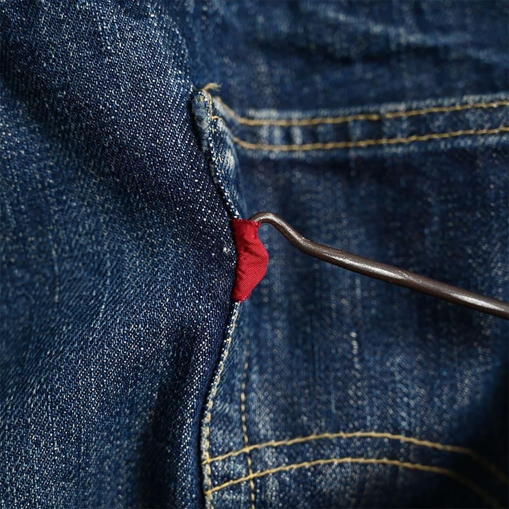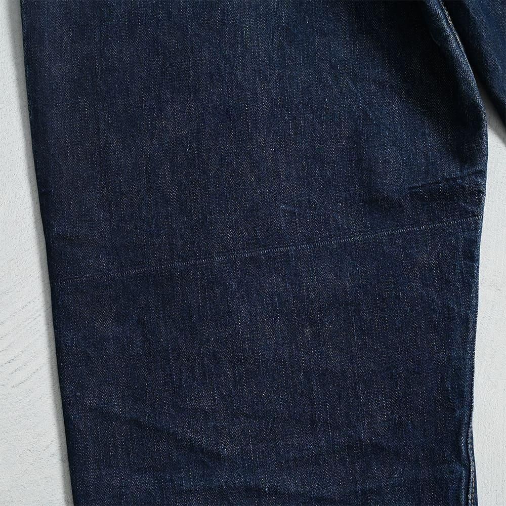 重量感があり黒っぽいインディゴデニム、プツプツ感のある生地感も片面ならでは。